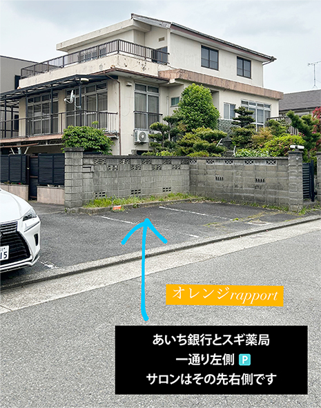 中京銀行とスギ薬局の一通を入り左側に駐車場(オレンジ看板)サロンはその先右側となります。