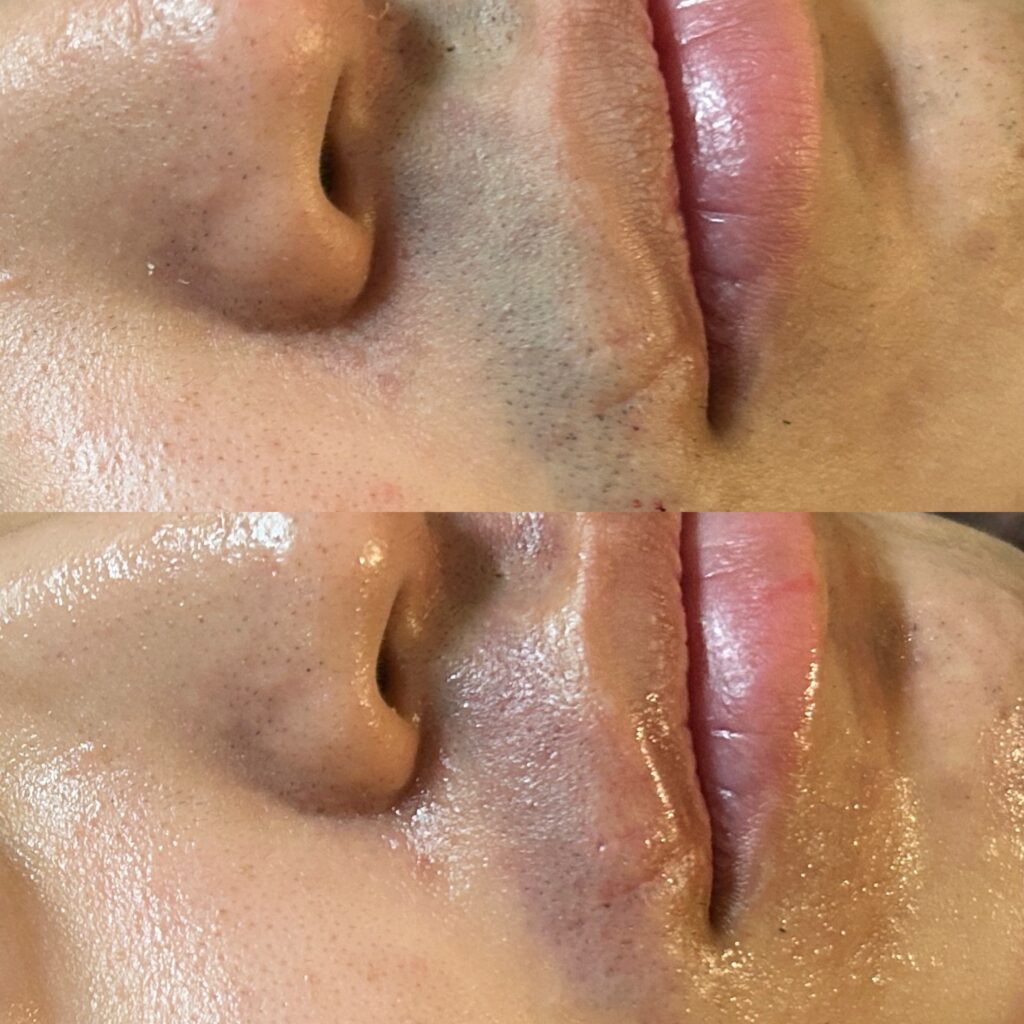 (大学生、モニター様、初回照射前➡︎照射直後 脱毛を行いましたが唇ふっくらプリプリになりました、初回ですが反応とても良いです。処理できたヒゲは自然と抜け落ちていきます、脱毛だけでなく美肌を作る美肌脱毛となります)